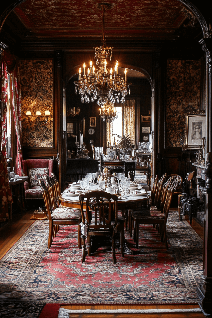 Victorian influence brings layered drama to antique dining rooms through intricate woodwork and richly styled surfaces. Ornamental paneling and sculpted furniture establish a strong sense of heritage. A substantial dining table paired with cushioned seating adds comfort to the formality. Sparkling chandeliers and carefully arranged table settings heighten the ceremonial feel. The room feels lavish without losing warmth.