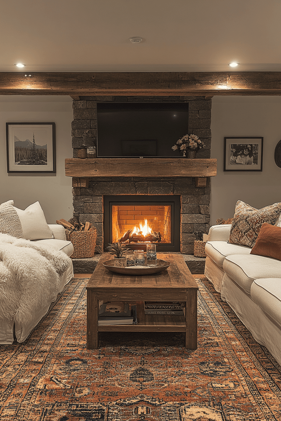Natural character defines basement family room ideas inspired by rustic charm and warmth. Wood accents and textured materials add depth to the space. Earthy tones ground the design while maintaining comfort. Soft lighting enhances the cozy atmosphere beautifully. The room feels relaxed yet intentional.