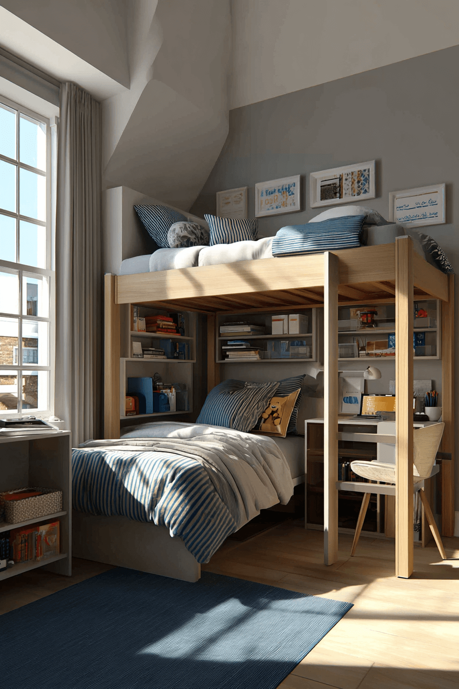 Focused routines benefit from loft beds for small rooms that dedicate the lower area to studying. Built-in desks and shelving encourage organization and concentration. The raised bed keeps rest separate from work. This layout supports productivity daily. Small rooms stay efficient.