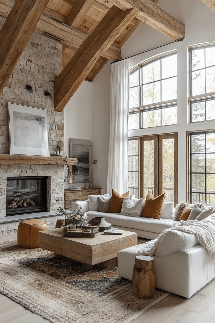 This welcoming modern farmhouse interior living space combines natural wood details with clean, contemporary furnishings for an effortlessly balanced look. Soft, neutral tones keep the room feeling open and bright while textured layers add warmth. Large windows invite natural light and highlight the connection to the outdoors. A statement fireplace grounds the design with cozy sophistication. The space feels relaxed yet refined.