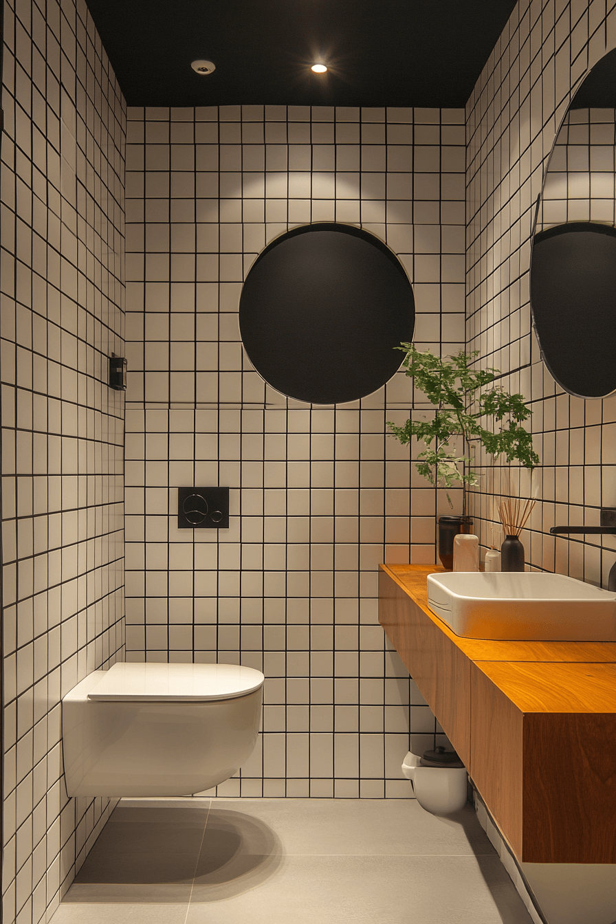 Bold simplicity enhances small bathroom tile ideas when black-and-white palettes are styled with intention. High contrast creates structure while maintaining a clean, modern feel. This color combination pairs effortlessly with chrome fixtures and minimalist decor. Linear layouts or subtle checker patterns add visual rhythm without clutter. The space feels crisp, balanced, and thoughtfully designed. Explore monochrome tile ideas that bring timeless polish to small bathrooms!