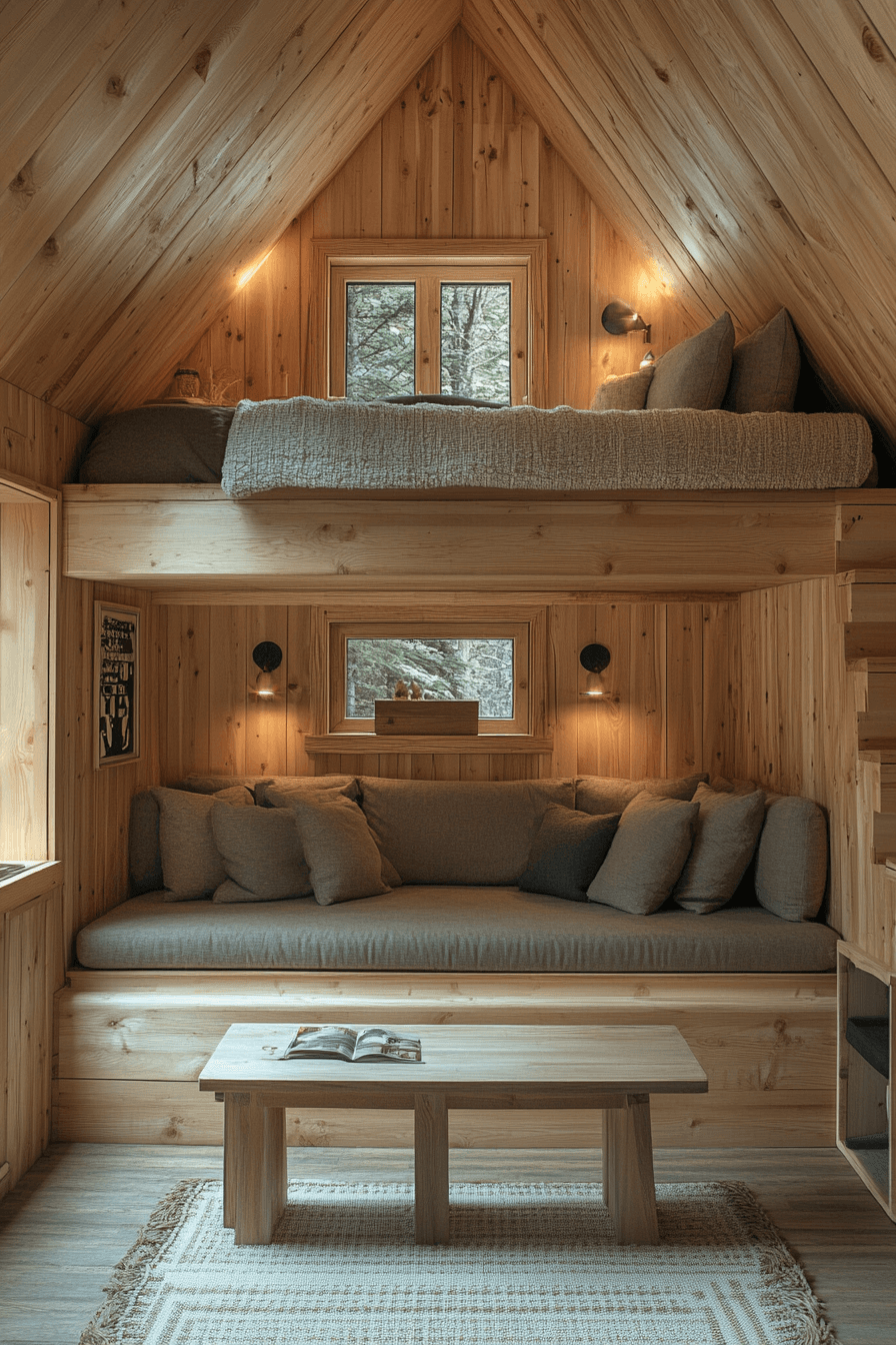 Creating loft-style bedrooms allows tiny cabins interiors to take full advantage of vertical space. Elevating the bed opens up valuable room below for seating, dining, or work zones. Carefully planned lofts often include sturdy stairs, integrated lighting, and safety railings for everyday comfort. Warm wood finishes and plush textiles help the upper level feel welcoming and secure. This design approach adds function without crowding the layout. Discover loft bedroom concepts that make compact cabins feel thoughtfully expanded!